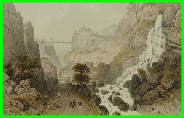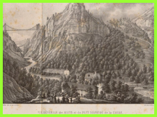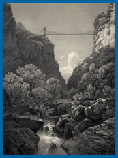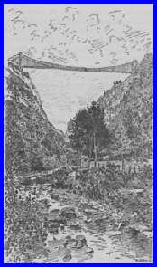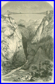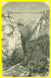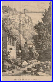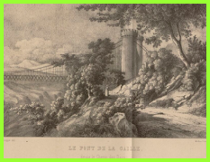 Lithographie du 19ème siècle du pont suspendu et des bains
