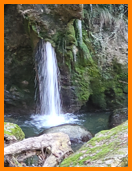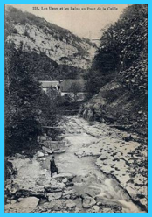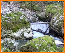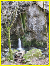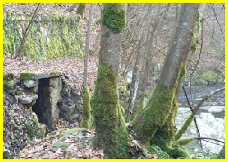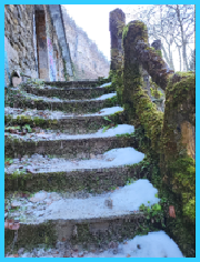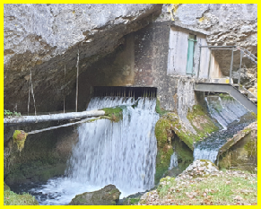 Ici à gauche de l’entrée du chemin d’accès aux bains cette source jaillit de la montagne dite « du Châtelard » et l’on aperçoit un peu plus loin sur la partie droite cette petite cascade qui se jette dans les Usses. Sur cette dernière photo prise à proximité du bâtiment Les Galeries la cascade est à sec en ce mois de février mais l’odeur de soufre est très caractéristique (photos Louis Buda 15 février 2023).