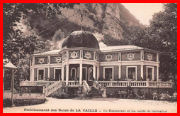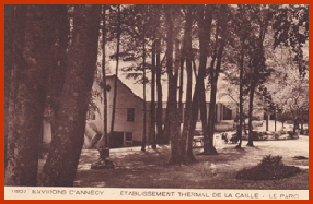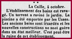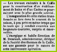 Après le décès de M. Louis Secrétan vers 1883 c’est sa veuve, Madame Rose Falconnet, qui reprend l’exploitation des bains mais qui déléguera la gestion à une société lyonnaise qui semble être la Société des Thermes de la Caille. Une nouvelle route carrossable sera créée. A noter que c’est dans ce dernier article que l’on trouve la mention « casino » qui semblerait donc exister depuis 1884.