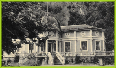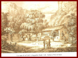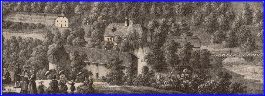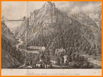 Les bains de la Caille selon une lithographie de Müller publiée en 1853 extraite de l’ouvrage La Caille son établissement thermal son pont et ses environs de Paul Collet (source Gallica-