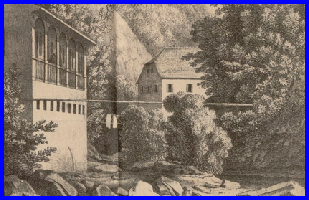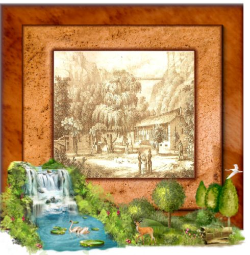 Les bains de la Caille selon une lithographie de Ledoux extraite de l’ouvrage La Caille son établissement thermal son pont et ses environs de Paul Collet publié en 1853
