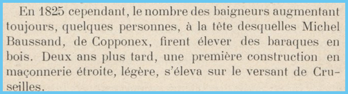 En avril 1801, une commission est constituée pour constater la valeur thérapeutique de ces eaux. En 1825 un certain Michel Baussant de Copponex fit construire des baraques en bois qui s’avérèrent rapidement insuffisantes par rapport aux personnes qui affluaient et en 1827 une première construction en maçonnerie sera érigée sur le versant de Cruseilles.