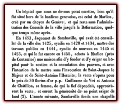 C’est en 1453, le 27 mai, que Jaquemet de Sambaville achète une maison à Marlioz pour fonder un hôpital afin d’accueillir les pèlerins. Il place cet hôpital sous le patronage de Saint-