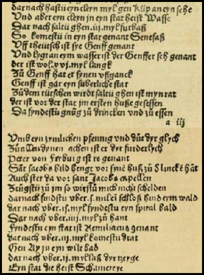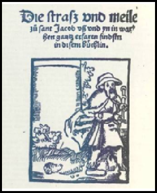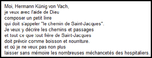 J’ai donc appris qu’au 15ème siècle un moine des environs de l’Abbaye de Strasbourg, Herman Künig von Vach, avait rédigé un guide rimé à l’usage des pèlerins. Ce guide a été imprimé en 1495 à Strasbourg et il regroupe des renseignements et recommandations parfois succincts sur notamment les itinéraires à prendre, les lieux d’hébergement ainsi que les auberges à fréquenter.