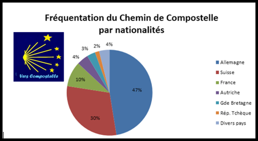 Les pèlerins qui arrivent dans notre région (en provenance de France et aussi d’autres pays comme l’Allemagne, l’Autriche, la Suisse et la Belgique) rejoignent la voie du Puy en Velay. Cette voie se situe à 1530 km environ avant d’atteindre Compostelle. C’est actuellement la plus fréquentée car elle est entièrement balisée et elle comporte beaucoup de centres d’accueil et d’hébergement.