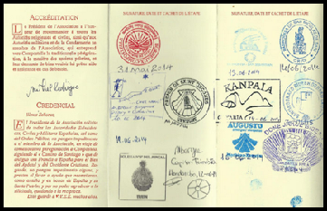 Parmi ses affaires, le pèlerin ne peut oublier d’emporter la « credencial » qui est une sorte de carnet de route. Il permet notamment l’accès aux hébergements dans la limite des places disponibles. Le détenteur de ce document garde ainsi une trace des lieux traversés grâce aux tampons apposés par les gîtes ou les Offices de Tourisme.
