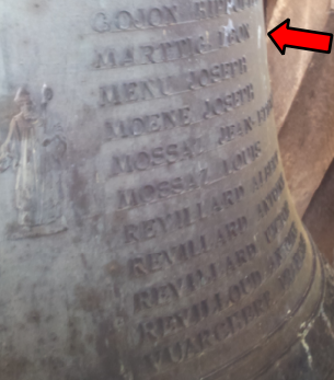 Alors que je réalisais une visite de l’église le 30 juin 2012, j’ai eu la possibilité d’accéder au clocher pour photographier les cloches Paccard. Après une montée périlleuse réalisée sur un escalier en très mauvais état, j’ai été stupéfaite par ce que j’ai découvert. Dans le clocher, deux cloches sont installées.