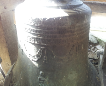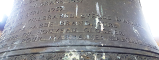 Une petite cloche avec une inscription en latin : il s’agit de l’ancienne cloche Paccard de 300 kg installée en 1825.