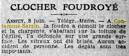 Le 8 juin 1924, la foudre tombe sur le clocher de Contamine-