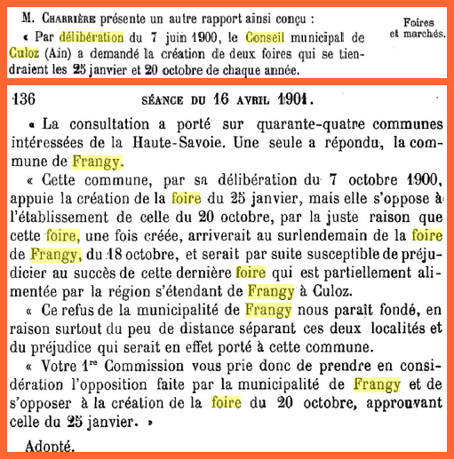 Le 16 avril 1901, le Conseil Général s’est penché sur la demande de la commune de Culoz qui souhaitait organiser deux foires annuelles les 25 janvier et 20 octobre. La municipalité de Frangy s’est opposée à la mise en place de la foire de Culoz le 20 octobre qui intervenait le surlendemain de la foire de Frangy qui se tenait le 18 octobre. A noter que les deux localités sont distantes de 28 km environ.