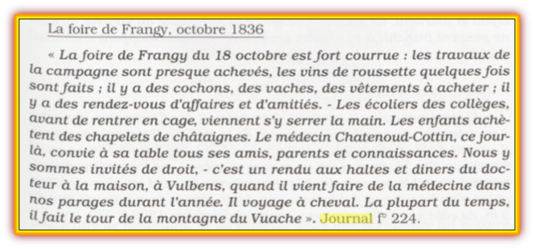 Durant la période sarde et le rétablissement des princes de Savoie (de 1815 à 1860), les foires ont continué d’exister. J’ai trouvé un court extrait du journal de Victor Gay de Vulbens qui fait état de la foire de Frangy le 18 octobre 1836.