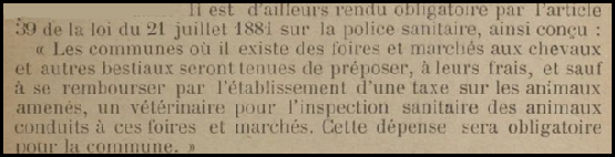 Dès février 1897 et en application de la loi du 21 juillet 1881 le préfet imposera une surveillance sanitaire du bétail afin d’enrayer la propagation de certaines maladies liées aux échanges commerciaux. Dans un premier temps, cette fameuse loi de 1881 sera difficilement applicable dans les campagnes en raison de la charge financière élevée qui devra être assumée par les communes qui organisent les foires pour payer les indemnités du vétérinaire désigné par le service sanitaire départemental.