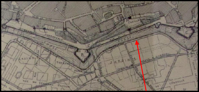 Plan des fortifications de Genève en 1602 (superposé au plan actuel de la ville) avec l’emplacement du mur des réformateurs dans le parc des Bastions