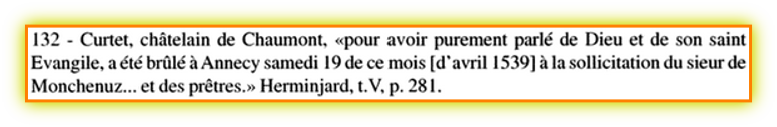 Le 19 avril 1539, le châtelain de Chaumont, Louis Curtet, sera d’ailleurs brûlé vif au Pâquier à Annecy.