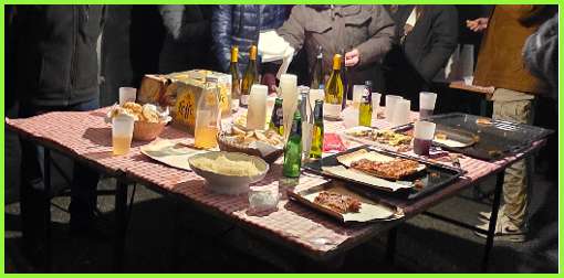 A partir de 20h00, les habitants (petits et grands) semblent apprécier le buffet malgré le froid.