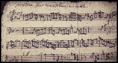 Photo d’un manuscrit conservé à la Bibliothèque de l’Arsenal de Paris où l’on trouve l’indication instrumentale « Sonatine pour mandoline et clavecin » au début du premier mouvement de la sonate K 89