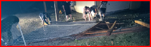 Ici les voisins déblaient des panneaux métalliques et des poutres tombés sur ma clôture.