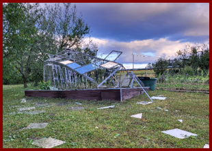 Ma serre n’a pas résisté. Elle a été complètement disloquée et il y a du verre partout dans le jardin.