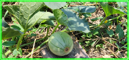 J’ai trouvé un melon le 13 juillet qui a prospéré sans aucun entretien. J’avais semé à tout hasard quelques plants après avoir récupéré les graines sur un melon qui m’avait été donné l’an passé par Céline.