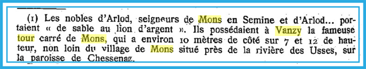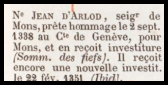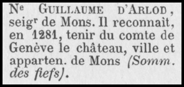 En 1281, un Guillaume d’Arlod est le premier seigneur connu de Mons d’après un acte de reconnaissance de fief (source Wikipédia).