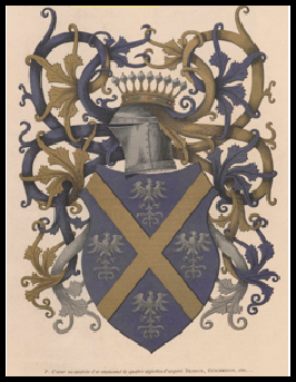 L’armorial de la famille de la Fléchère porte d’azur au sautoir d’or cantonné de quatre aiglettes d’argent (photo source Armorial et nobiliaire de l'ancien duché de Savoie, volume 2 page 388, BNF-
