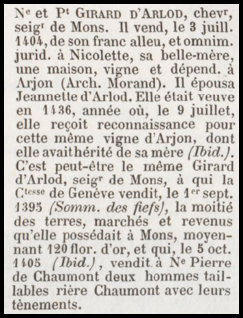Jeannette d’Arlod, veuve, épousera en 1436 Noble et Puissant Girard d’Arlod, chevalier et seigneur de Mons.