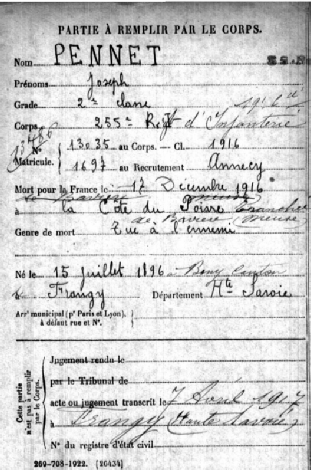 C’est sans doute au cours de l’assaut donné le 15 décembre 1916 que Joseph Pennet fut tué sur la côte du Poivre près de Louvemont dans la Meuse le 17 décembre 1916. Il avait à peine 20 ans. Il est inhumé à la nécropole nationale de Bras-