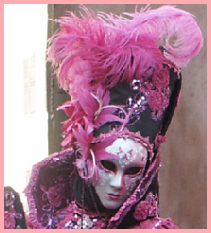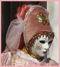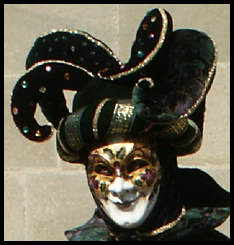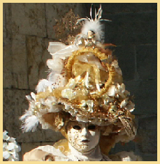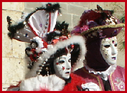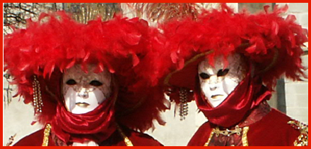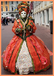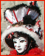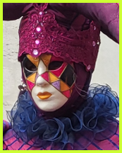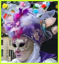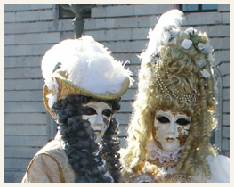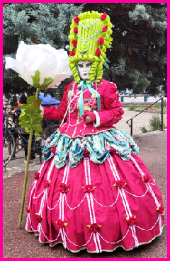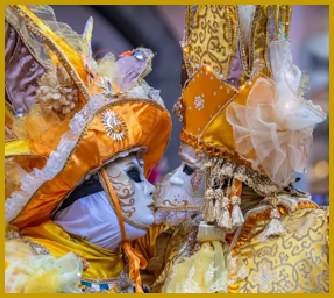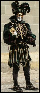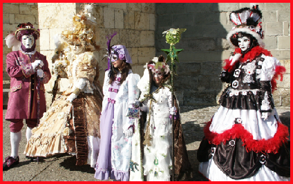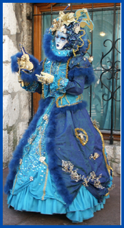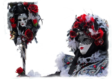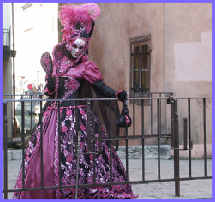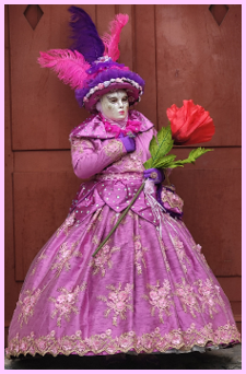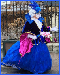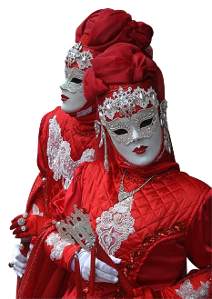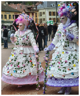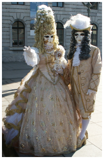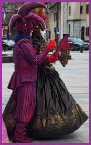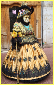 Pour l’historique le visage est recouvert d’un loup ou grimé. Ces costumes sont ceux portés par les familles vénitiennes lors de soirées. L’homme porte la « bauta » et la femme le loup. Ces modèles remontent au 18ème siècle (source le Dauphiné Libéré du 5 mars 2024).
