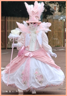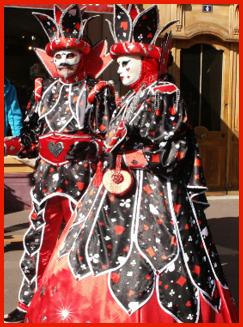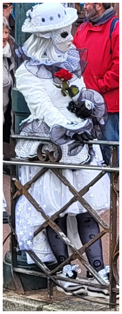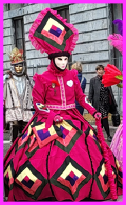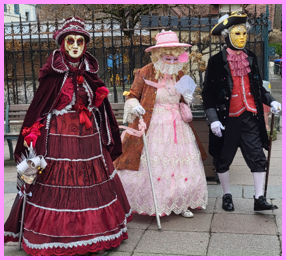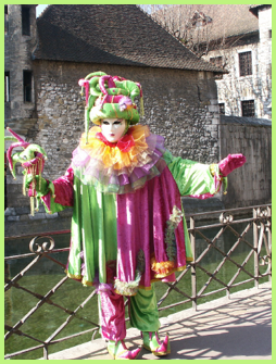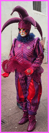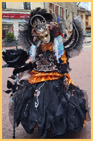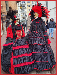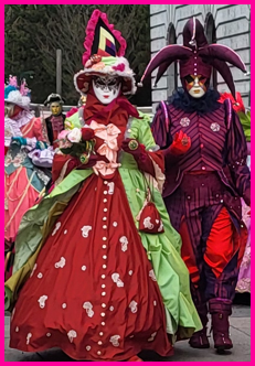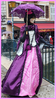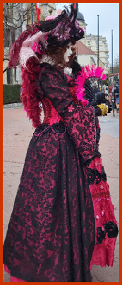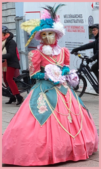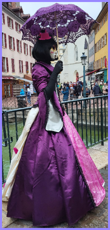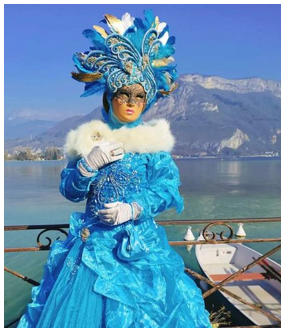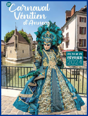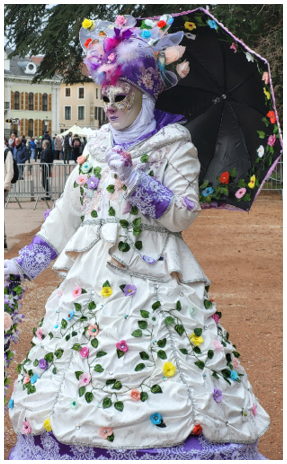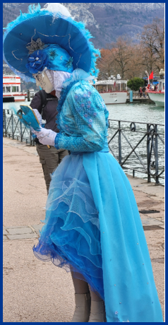 Je pensais que ce carnaval était ancien et qu’il remontait d’avant 1860, à une époque notamment où la Savoie et la Haute-Savoie, faisaient partie du royaume de Sardaigne. Mais non ce n’était pas ça. Ce carnaval date de 1996 et les costumes s’inspirent de la tradition vénitienne qui rappellent les liens étroits qui unissent la ville haut-savoyarde d’Annecy et l’Italie (informations source Internet www.lecocondenotredameannecy.com). C’est en 1995 que la ville d’Annecy établit un jumelage avec Vicenza dans la plaine du Pô située dans le nord de l’Italie, à mi-chemin entre Venise et Vérone (source Le Dauphiné Libéré du 5 mars 2024).