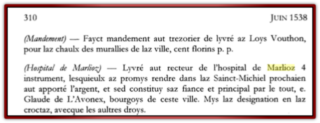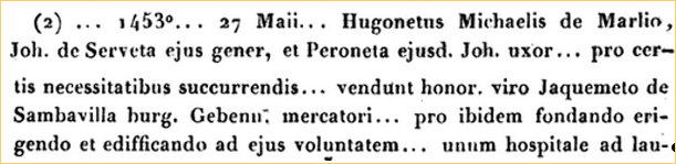 C’est en 1453, le 27 mai, que Jaquemet de Sambaville achète une maison à Marlioz pour fonder un hôpital afin d’accueillir les pèlerins. Il place cet hôpital sous le patronage de Saint-