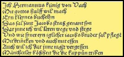 J’ai donc appris qu’au 15ème siècle un moine des environs de l’Abbaye de Strasbourg, Herman Künig von Vach, avait rédigé un guide rimé à l’usage des pèlerins. Ce guide a été imprimé en 1495 à Strasbourg et il regroupe des renseignements et recommandations parfois succincts sur notamment les itinéraires à prendre, les lieux d’hébergement ainsi que les auberges à fréquenter.