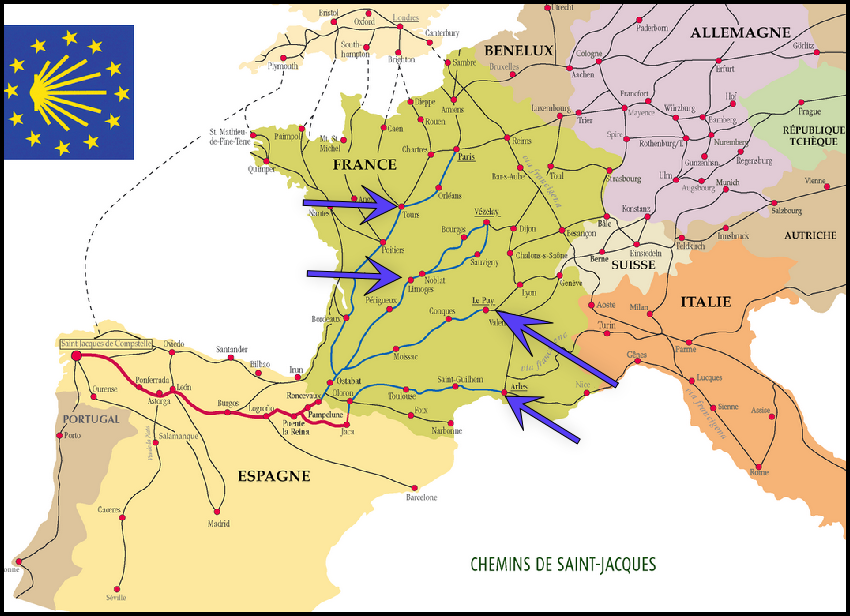 Tous les marcheurs reconnaissent facilement la signalétique apposée sur les poteaux et panneaux indicateurs qui jalonnent les chemins à emprunter (les pèlerins suivent les voies signalées par une coquille jaune sur fond bleu). Dans l'histoire du pèlerinage à Compostelle, quatre villes françaises se sont imposées comme points de ralliement et elles sont aujourd'hui le point de départ pour la majorité des pèlerins :