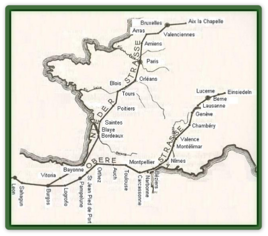 L’itinéraire débute au sud du lac de Zürich à Einsiedeln (ObereStrasse). Le retour (NiederStrasse) traverse toute la France et se termine par Aix la Chapelle pour entrer en Allemagne.
