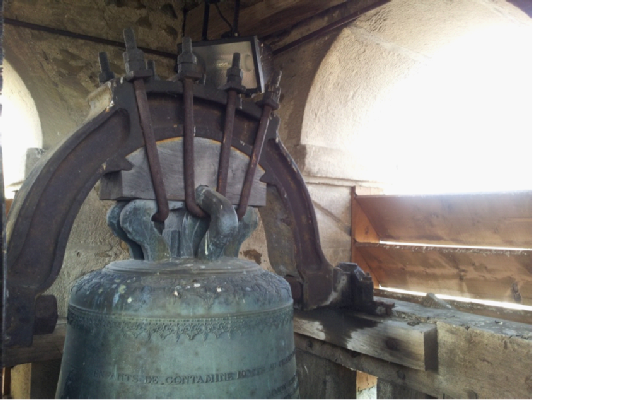 Alors que je réalisais une visite de l’église le 30 juin 2012, j’ai eu la possibilité d’accéder au clocher pour photographier les cloches Paccard. Après une montée périlleuse réalisée sur un escalier en très mauvais état, j’ai été stupéfaite par ce que j’ai découvert. Dans le clocher, deux cloches sont installées.