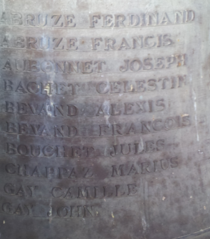Sur la seconde moitié les noms de 21 soldats morts durant la première guerre mondiale. Le texte est gravé comme suit : « enfants de Contamine morts au champ d’honneur » et suivent sur deux colonnes les noms des soldats par ordre alphabétique. Un détail important est à relever : Léon MARTIG (né le 19 janvier 1895) ne figure pas sur le monument aux morts de Contamine-