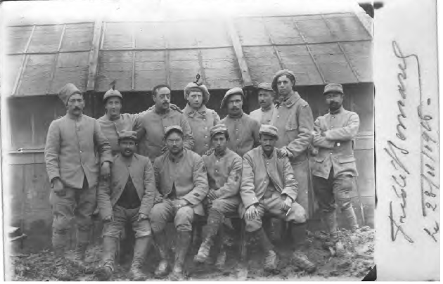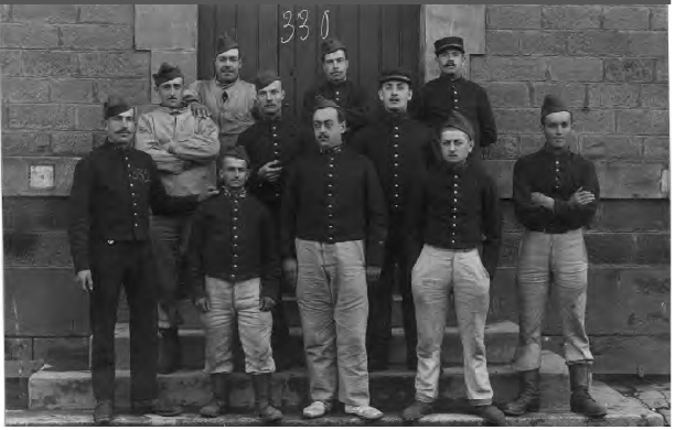 Un groupe de soldats en mai 1917. Il est indiqué au dos de cette photo « triste souvenir ». Il est peut être ici fait référence aux mutineries collectives qui se sont déclarées entre le 20 mai et le 10 juin 1917.