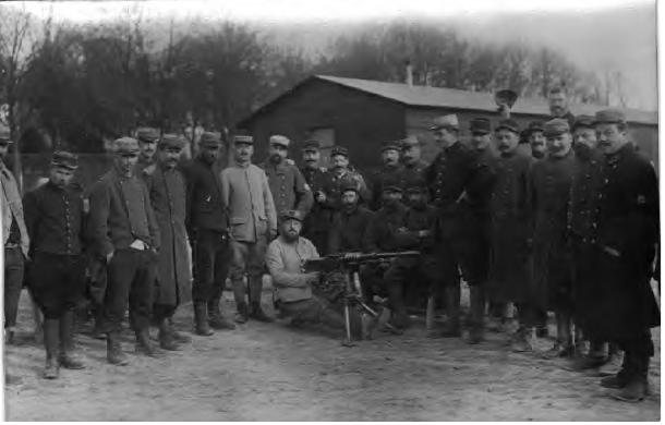 Groupe de soldats autour d’une mitrailleuse, probablement une Hotschkiss 1914, qui était la principale arme automatique réglementaire de l’armée française à partir de 1915