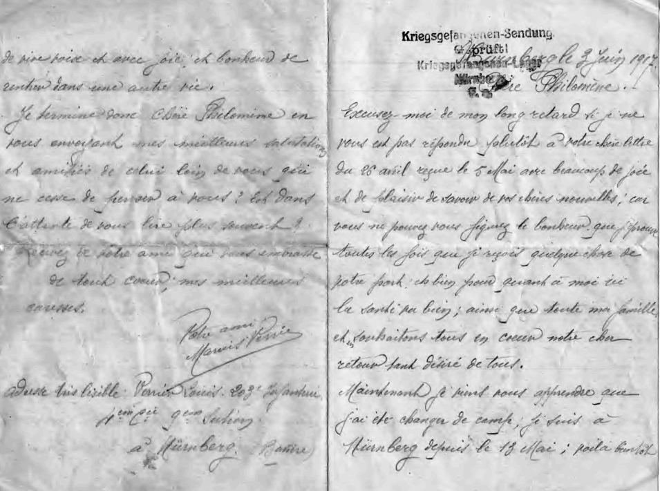 Ici un courrier du 3 juin 1917 d’un soldat du 203ème Régiment d’Infanterie prisonnier dans le camp de Nürenberg (Nürnberg) en Bavière (collection privée)