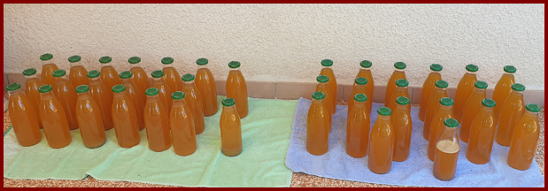 Et puis durant cet hiver nous aurons toujours le plaisir de consommer les fruits et légumes que nous avons récolté cet été et qui sont conservés par diverses méthodes : cornichons au vinaigre, coulis de tomates stérilisés, cerises et mirabelles stérilisées, poivrons à l’huile d’olives et vinaigre, jus de pommes stérilisé, cidre ainsi que toutes les gelées et confitures (framboises, cassis, mirabelles, mûres).