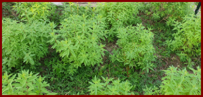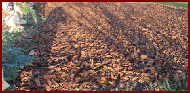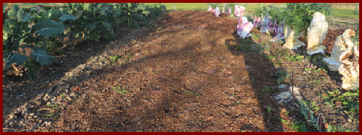 A gauche une partie du potager est recouvert par plusieurs couches de feuilles mortes et à droite le sol est recouvert par du broyage de végétaux comme le tamaris.