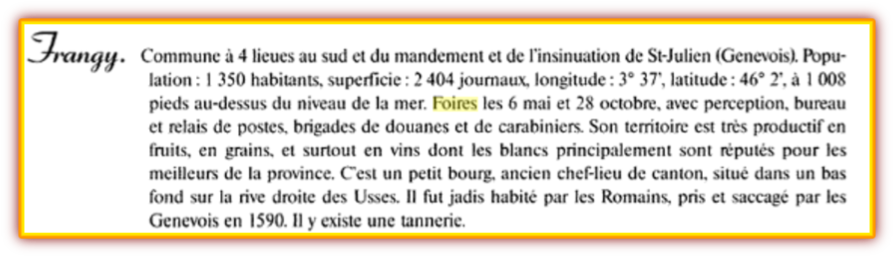 La foire de Frangy qui est désormais organisée le 8 mai existe étonnamment depuis fort longtemps. La plus ancienne information que j’ai pu retrouver sur ce sujet se trouve dans l’ouvrage ci-