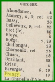 Les foires d’octobre à Frangy ont probablement perduré jusqu’au 20ème siècle. Il semblerait également qu’à partir de 1839 deux foires étaient organisées au printemps et à l’automne respectivement les 6 mai et 28 octobre.