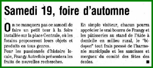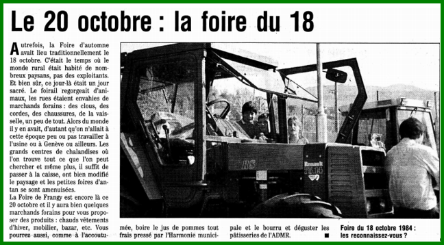 En octobre 1995 la foire d’automne redémarre à Frangy et il semblerait qu’elle ait perdurée jusqu’au 14 octobre 2010.