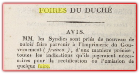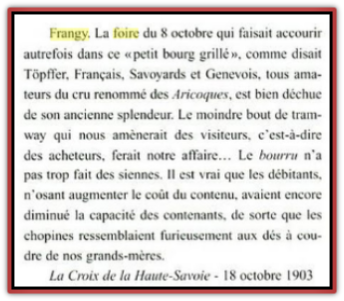 Durant la période sarde et le rétablissement des princes de Savoie (de 1815 à 1860), les foires ont continué d’exister. J’ai trouvé un court extrait du journal de Victor Gay de Vulbens qui fait état de la foire de Frangy le 18 octobre 1836.