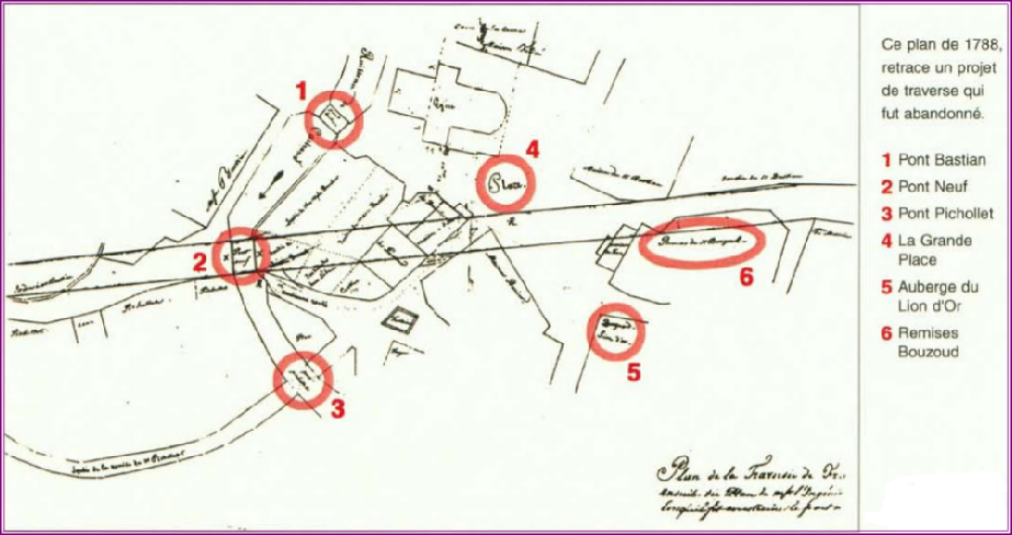 L’emplacement de cet ancien pont se trouve sur l’actuel passage qui descend à droite du monument aux morts (source La Gazette de Frangy n° 10 page 8). Cette décision va également permettre à Frangy de s’agrandir à l’ouest.