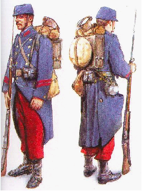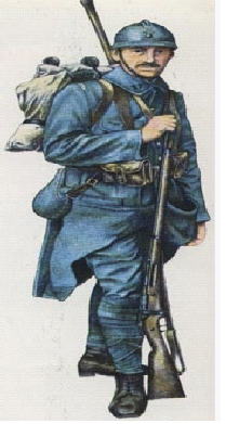 Lors de la mobilisation en août 1914 l’uniforme des soldats est très proche de celui porté durant la guerre de 1870. Il est très voyant car le pantalon ainsi que le képi sont de couleur rouge. Il sera vite fourni des couvre-képi gris-bleu ou bleu-clair. Malheureusement, cet équipement inadapté coûtera la vie à des milliers de soldats les premiers mois du conflit. Ce ne sera qu’en août 1915 que le nouvel uniforme bleu clair sera adopté.