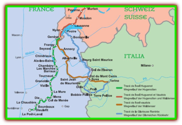 Ce sentier international de grande randonnée de 1’600 km environ, initié par les descendants des protestants persécutés, suit le tracé historique de l’exil des Huguenots qui ont fui la France pour se rendre en Allemagne à partir de 1685. Au départ de Poët-