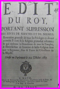 Supportant mal la cohabitation de deux cultes religieux dans son pays, Louis XIV va révoquer l’édit de Nantes le 18 octobre 1685 en signant un nouvel édit, celui de Fontainebleau. Le protestantisme devient alors interdit sur le territoire français. Cette décision va entraîner l’exil d’au moins 200'000 protestants sur les 800'000 que comptait le royaume à la fin du XVIIe siècle (source Wikipédia). Ces protestants, issus de la bourgeoisie mais également des artisans et marchands, vont fuir la France en emportant leur savoir-