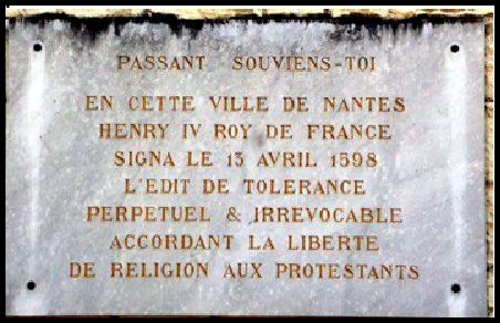 Le 15 avril 1598 le roi Henri IV signe l’édit de Nantes qui sera promulgué le 30 avril 1598. Il accorde notamment des droits de culte, des droits civils et des droits politiques aux protestants dans certaines parties du royaume. Cet édit met donc fin temporairement aux guerres de religion.