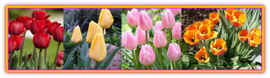 Les tulipes succèdent aux jacinthes en avril. Elles expriment les symboles de la gloire et de l’amour parfait. Attention en offrant un bouquet de tulipes car les tulipes rouges signifient « croyez en moi », les jaunes « je ne vois que le soleil dans votre sourire », les blanches le ciel, la nouveauté et la pureté, les pourpres la noblesse de cœur et les roses affection profonde et compassion. Ces indications varient quelque peu selon les informations qui sont publiées. Le mieux pour ne pas se tromper est de poser la question au moment de son achat auprès d’un fleuriste.